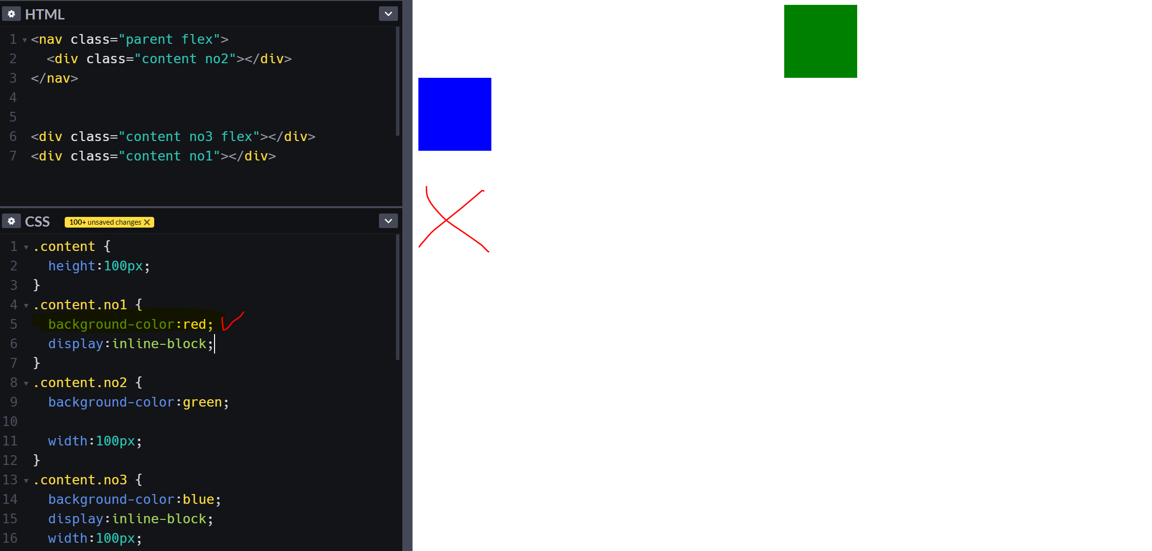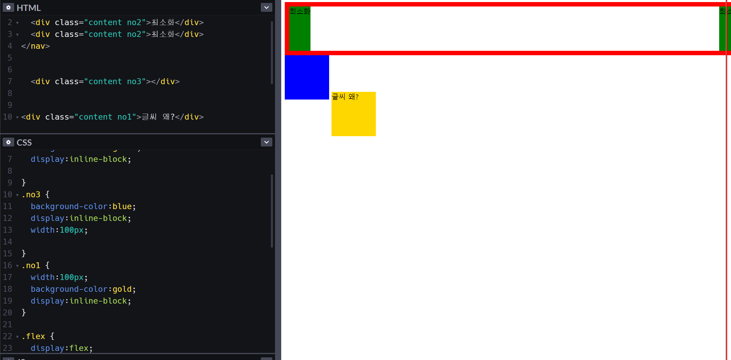 2. display:flex를하면 display:inline-block을 해도 한줄을 다 잡는다. 한줄을 나눠쓰지 않는다.