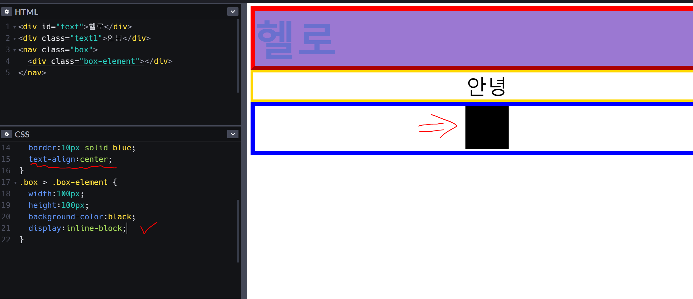?? 의문 -> display:inline-block; 을 2개의 요소에 적용하고 같은 줄에 나열되게 한 뒤, 글자를 입력하니 모양이 아래와 같이 나왔다. 왜 때문인지는 아직 모르겠음. ↓