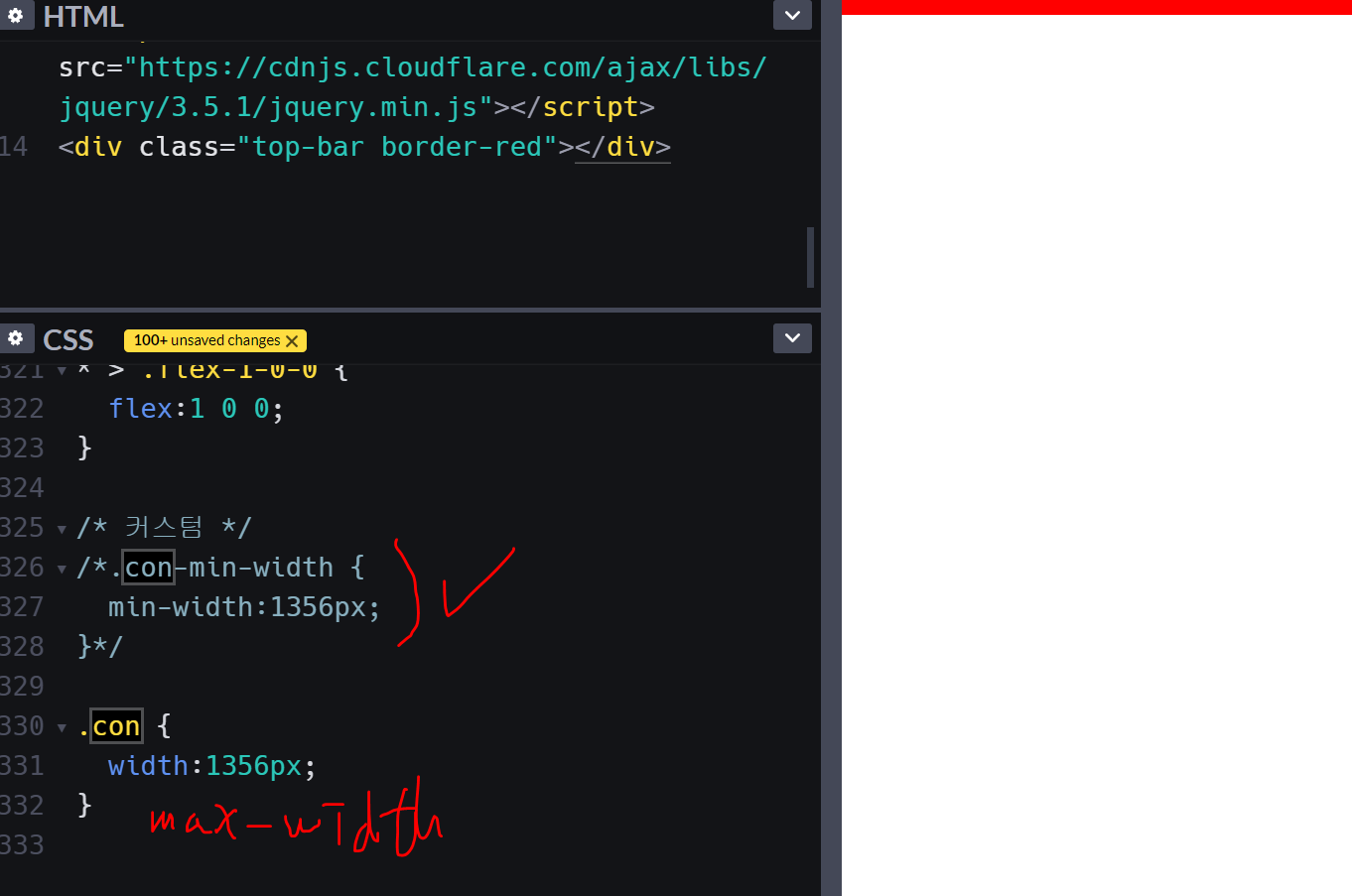 대신 max-width:1356px; max를 만들어서 최대 지정 크기보다 더 커지지 않게만 설정한다.