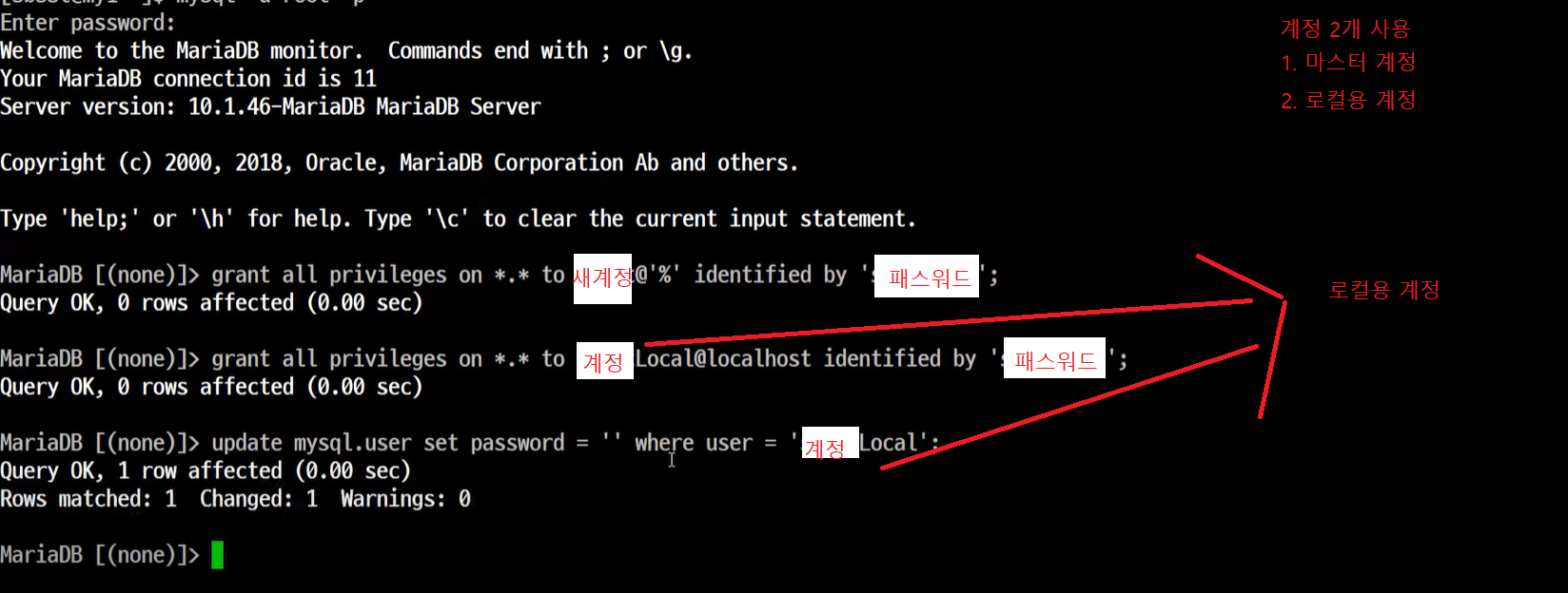- 새 계정에 관리자 권한을 모두 위임하는 코드를 입력한다.