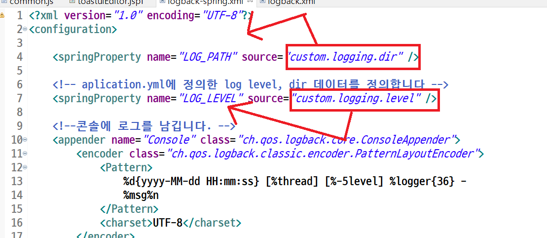 <!-- aplication.yml에 정의한 log level, dir 데이터를 정의합니다 -->