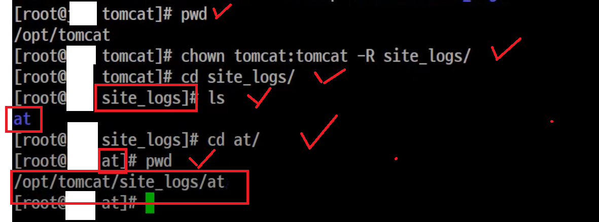 - /opt/tomcat/site_logs/at 현재 디렉토리가 조회되는 것을 확인.