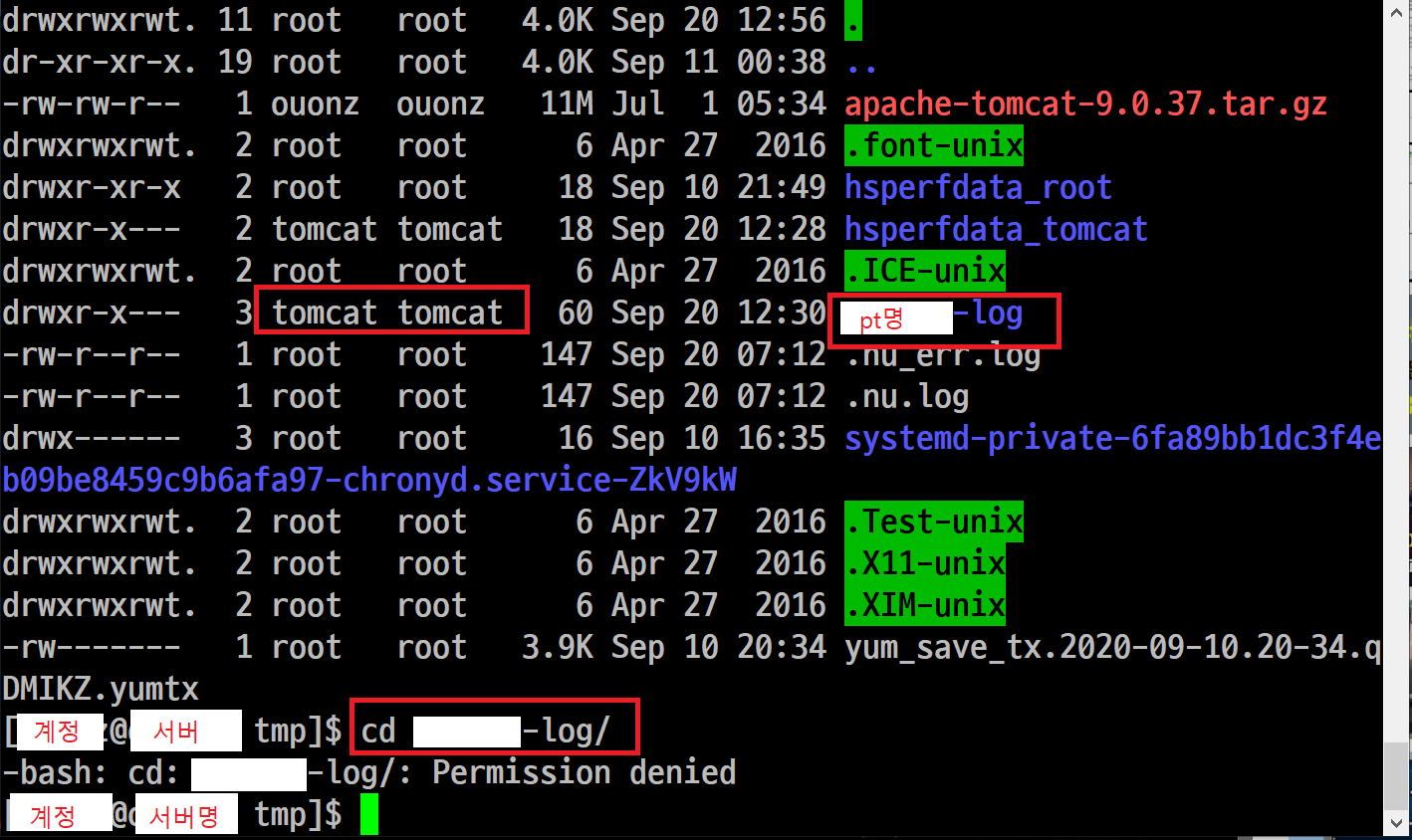 - 프로젝트명-log폴더의 소유권은 tomcat한테 있는 것을 확인할 수 있다.
