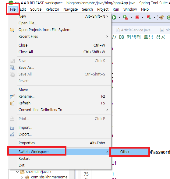1. 일단 File - Switch Workspace - Other로 새로운 workspace2를 만들어서(새로운 이클립스가 생기는것..)