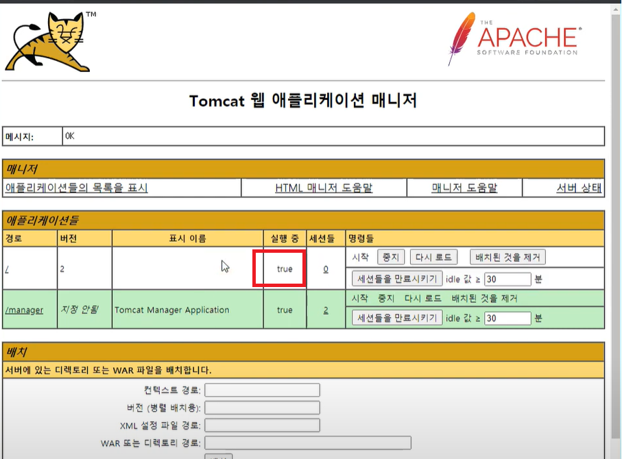 - tomcat이 재실행될 때에는 :8080/manager/html도 로딩을하며