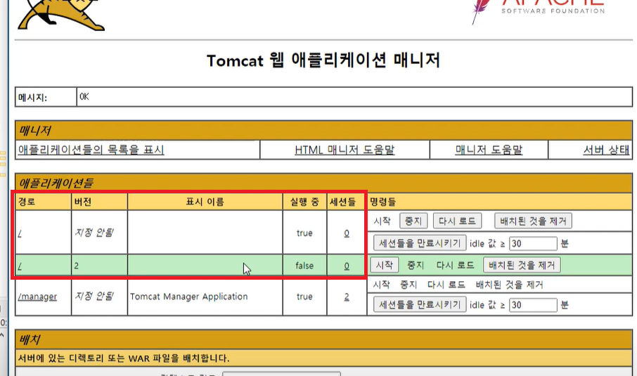 - <path>/ROOT##2</path>로 입력을 하면 Tomcat 웹 애플리케이션 매니저에 다른 경로로 서비스가 업로드 된다.