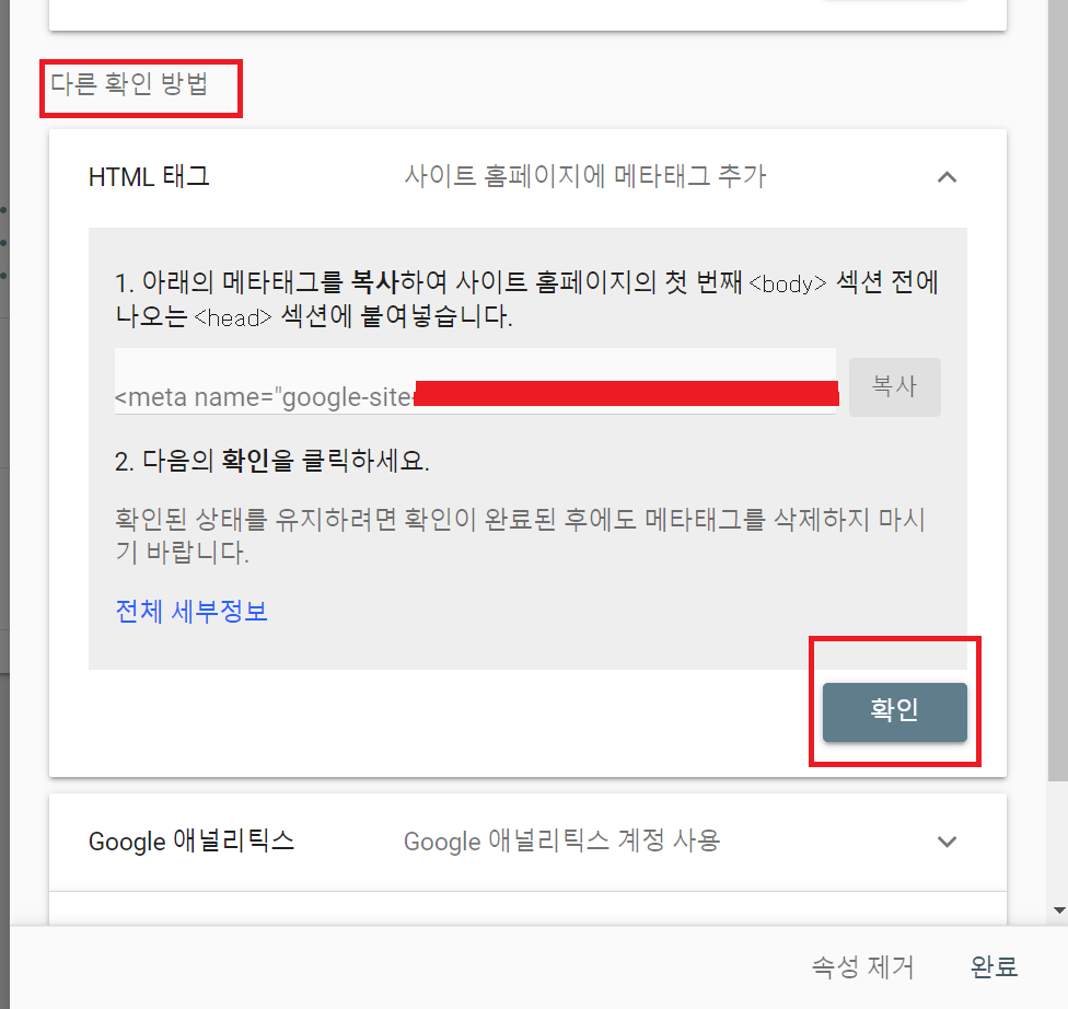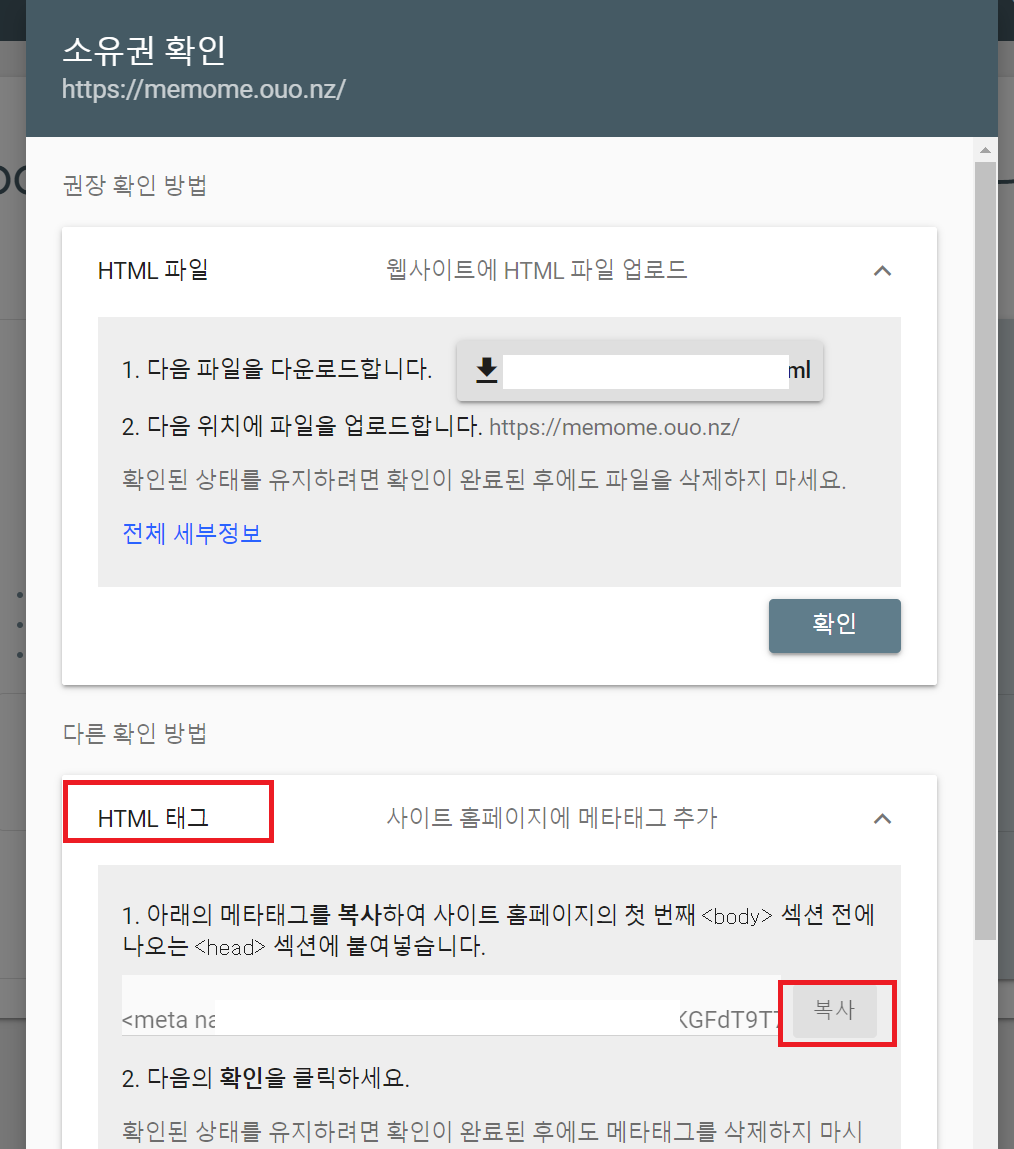 - 그 중에서 HTML 태그 방법을 선택하고, meta를 복사한다.