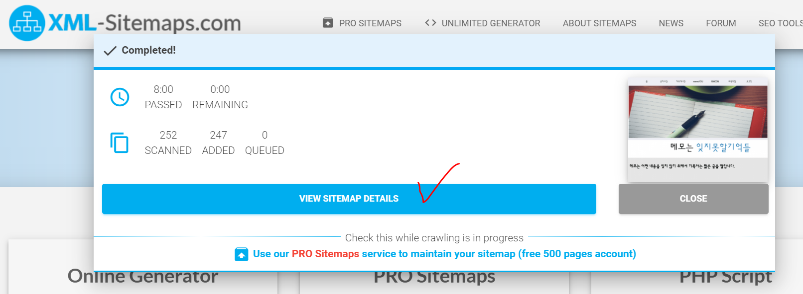 - 스캔이 다 되면 VIEW SITEMAP DETAILS 클릭