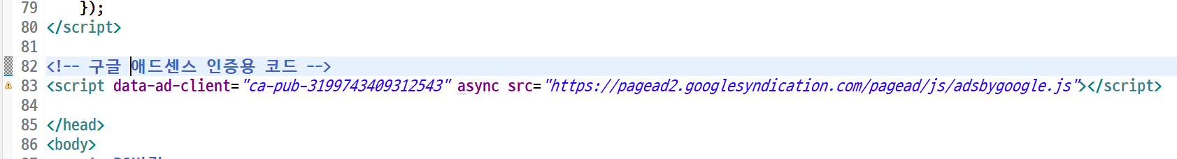 - 그리고나서 head.jspf에 애드센스 인증용 코드를 </head> 바로 앞에 입력해주었다.
