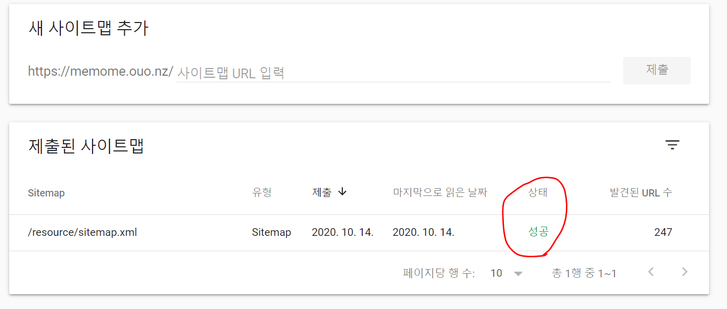 '제출' 버튼을 누르면 구글이 해당 sitemap.xml 파일을 학습하기 시작한다.