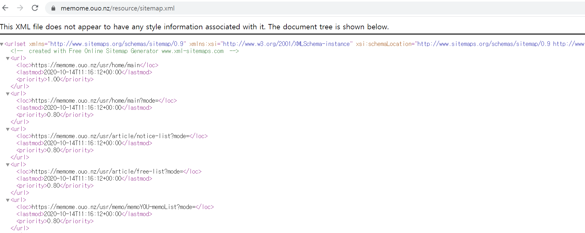 memome.ouo.nz/resource/sitemap.xml 주소를 입력하면 잘라내기, 붙여넣기한 xml 파일의 내용이 출력된다.