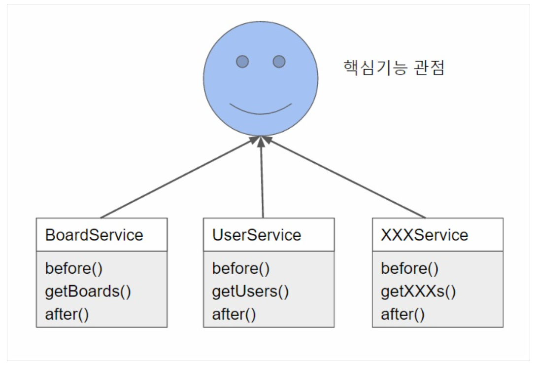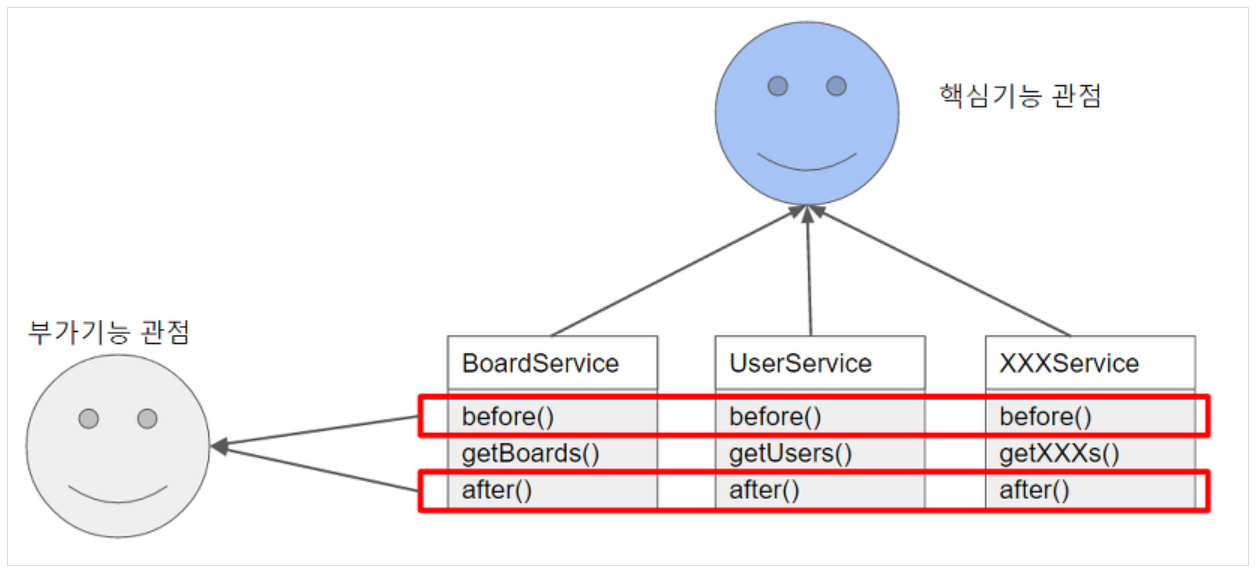부가적 기능의 관점엑서 보면 각각의 서비스는 before와 after 메소드를 공통으로 사용하고 있다.