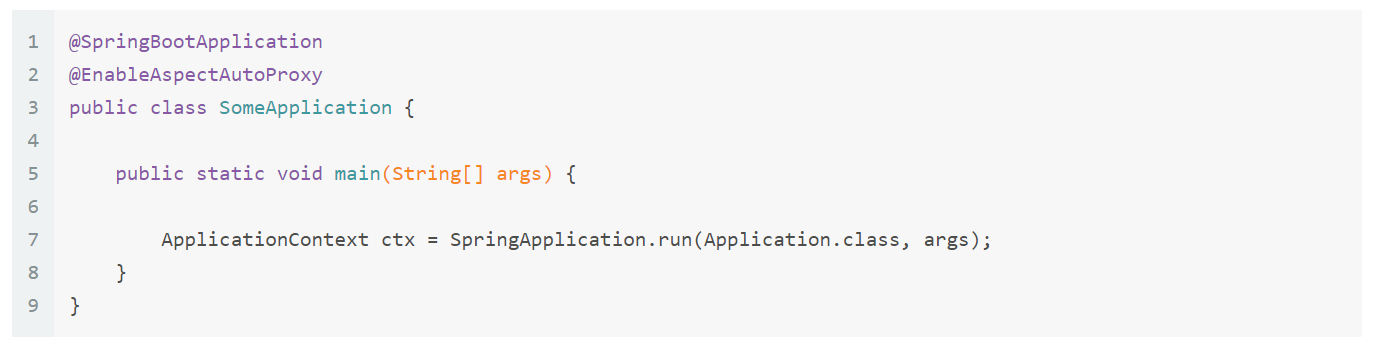- @SpringBootApplication 또는 @Configuration을 명시한 클래스에 @EnableAspectAutoProxy를 명시하면 Spring AOP를 사용하기 위한 첫 준비가 끝난다.