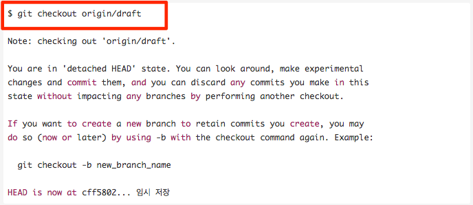 그러나 이경우에는 임시로 해당 브랜치로 이동하는 것이기 때문에 로컬 브랜치가 만들어지지 않습니다.