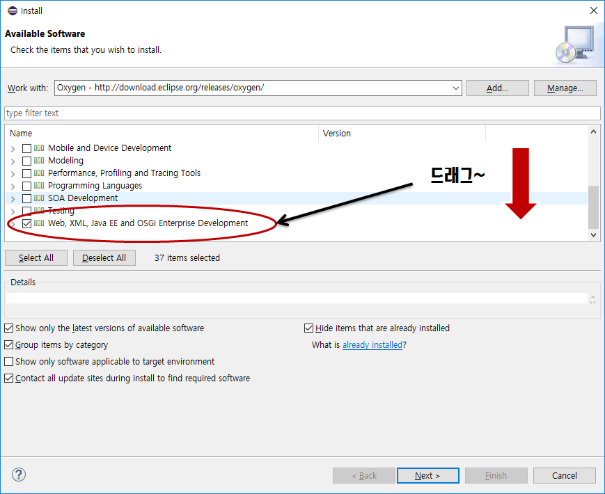여기에 Work with에 http://download.eclipse.org/releases/oxygen(이놈엔 여러분 이클립스 버전을 적어라) 까지 타이핑하면 목록에 주루륵 생긴다.